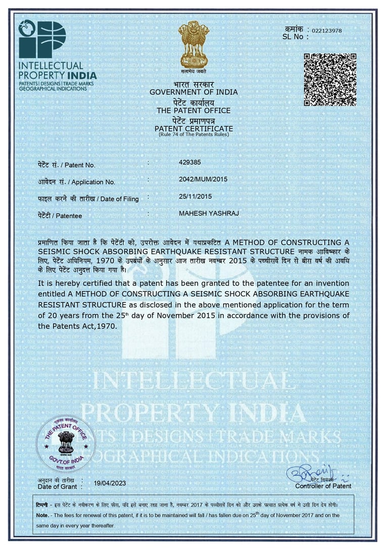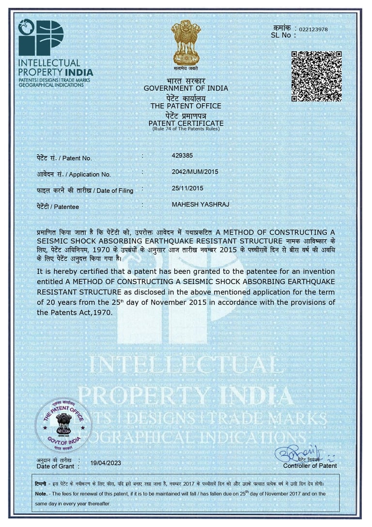 WIPO published our Invention on 1-6-2017. The Intellectual Property Department, Govt of India, has Granted [IP I Patent No. 429385] PATENT to our Technology ERST [Earthquake Resistant Structure Technology]